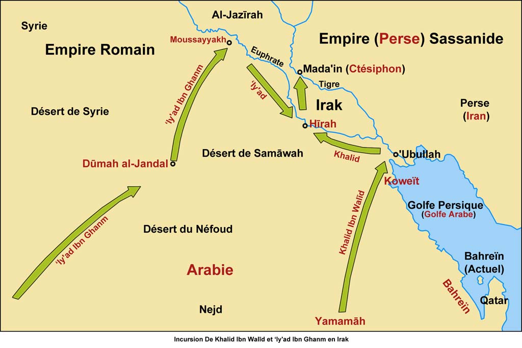 al-Mousayyakh, passa par Doūmah al-Jandal, puis continua vers Hīrah.