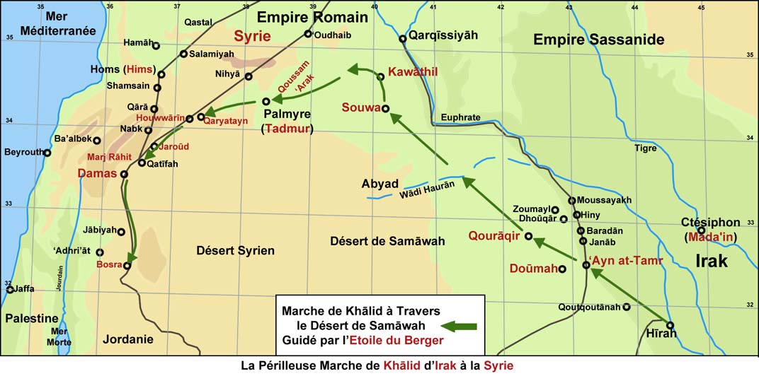 Khālid (qu’Allah soit satisfait de lui) de l’Irak vers la Syrie. Il